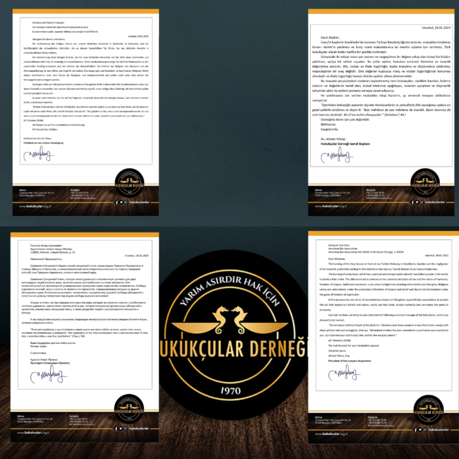 Hukukçular Derneği olarak dünyadaki 44 baroya 7 farklı dilde mektup gönderip İsveç’te mukaddes kitabımıza karşı yapılan çirkin eyleme sessiz kalmamaları için çağrıda bulunduk. Hepimizi derinden üzen bu eyleme karşı gönderdiğimiz mektupların birkaç örneğini kamuoyuna sunuyoruz.