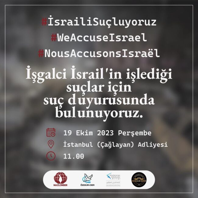İşgalci İsrail’in, Gazze’de sınır tanımaksızın işlediği suçlara ilişkin sorumlular hakkında suç duyurusunda bulunacağız. Tüm üyelerimizi, 19 Ekim Perşembe günü, saat 11.00’de İstanbul (Çağlayan) Adliyesine davet ediyoruz.