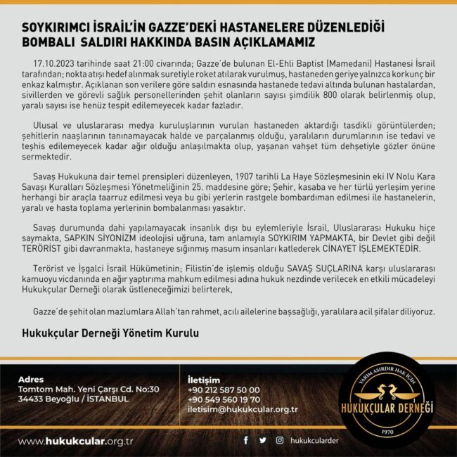 SOYKIRIMCI İSRAİL’İN GAZZE’DEKİ HASTANELERE DÜZENLEDİĞİ BOMBALI SALDIRI HAKKINDA BASIN AÇIKLAMAMIZ