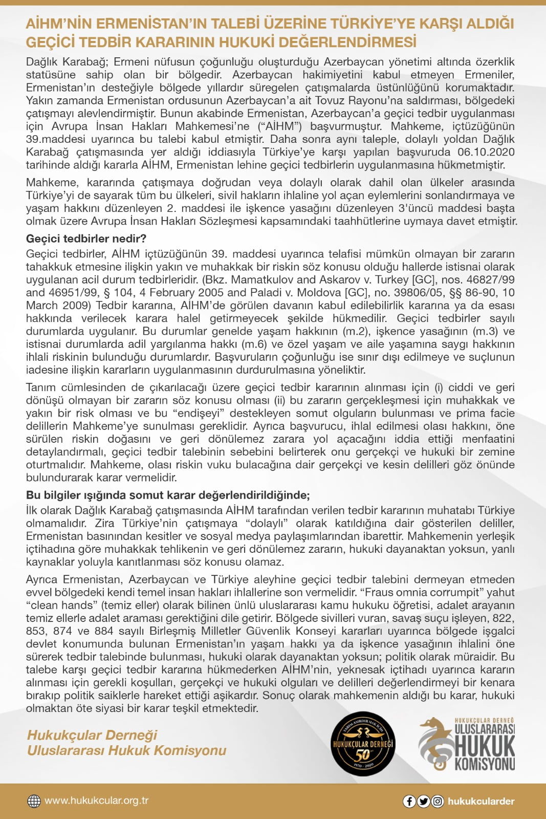 Dağlık Karabağ; Ermeni nüfusun çoğunluğu oluşturduğu Azerbaycan yönetimi altında özerklik statüsüne sahip olan bir bölgedir. Azerbaycan hakimiyetini kabul etmeyen Ermeniler, Ermenistan’ın desteğiyle bölgede yıllardır süregelen çatışmalarda üstünlüğünü korumaktadır. Yakın zamanda Ermenistan ordusunun Azerbaycan’a ait Tovuz Rayonu’na saldırması, bölgedeki çatışmayı alevlendirmiştir. Bunun akabinde Ermenistan, Azerbaycan’a geçici tedbir uygulanması için Avrupa İnsan Hakları Mahkemesi’ne (“AİHM”) başvurmuştur. Mahkeme, içtüzüğünün 39.maddesi uyarınca bu talebi kabul etmiştir. Daha sonra aynı taleple, dolaylı yoldan Dağlık Karabağ çatışmasında yer aldığı iddiasıyla Türkiye’ye karşı yapılan başvuruda 06.10.2020 tarihinde aldığı kararla AİHM, Ermenistan lehine geçici tedbirlerin uygulanmasına hükmetmiştir.