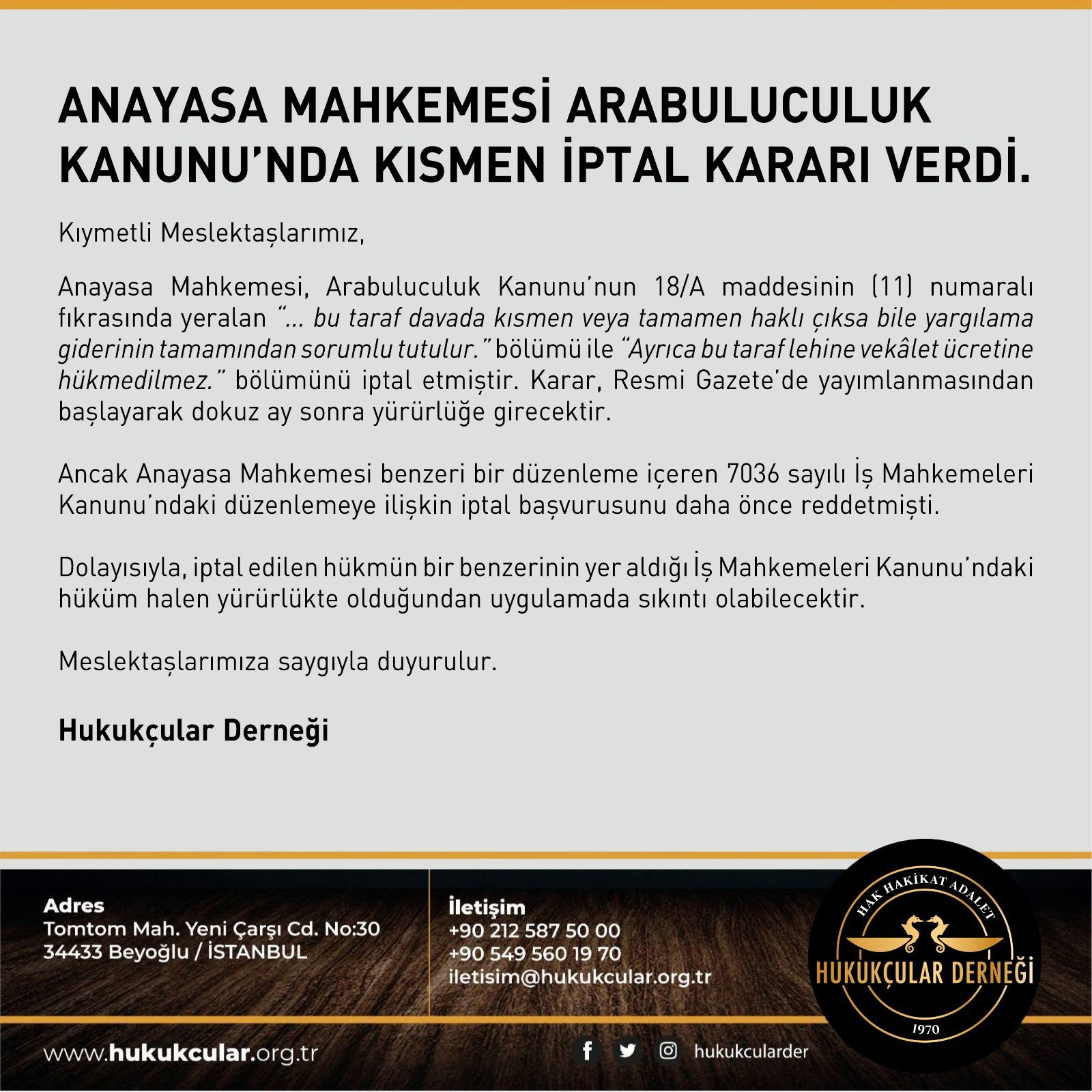 Anayasa Mahkemesi, Arabuluculuk Kanunu’nda Kısmen İptal Kararı Verdi. PAYLAŞ Payı FacebookPayı Facebook Share on XPayı X Payı WhatsAppPayı WhatsApp Benzer İçeriklerHukukçular Derneği 2. Olağanüstü Genel Kurulu – 202510 Ekim 20256 Ekim, İstanbul’un işgalden tamamen kurtularak yeniden Türk milletinin iradesine kavuştuğu gündür.6 Ekim 2025Yeni Adli Yıl, Hukukçular Derneği’nde Başladı1 Eylül 2025Cebrî İcra Kanunu Taslağına İlişkin İnceleme ve Görüş Anketi Yayınlandı29 Ağustos 2025