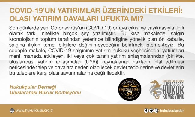 1. Giriş Son günlerde yeni Coronavirüs’ün (COVID-19) ortaya çıkışı ve yayılmasıyla ilgili olarak farklı nitelikte birçok şey yazılmıştır. Bu kısa makalede, salgın kronolojisinin toplum tarafından yeterince bilindiğine yönelik olan ön kabulle, salgına ilişkin temel bilgilere değinilmeyeceğini belirtmek istemekteyiz. [1] Bu sebeple makale, COVID-19 salgınının yatırım hukuku veçhesinden; yatırımları menfi manada etkileyen, iki veya çok taraflı…