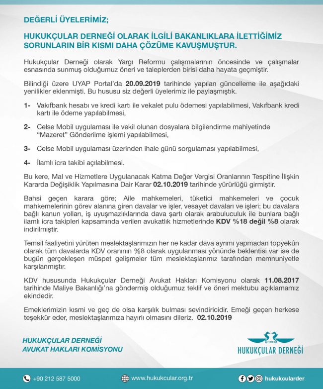 DEĞERLİ ÜYELERİMİZ; HUKUKÇULAR DERNEĞİ OLARAK İLGİLİ BAKANLIKLARA İLETTİĞİMİZ SORUNLARIN BİR KISMI DAHA ÇÖZÜME KAVUŞMUŞTUR. Hukukçular Derneği olarak Yargı Reformu çalışmalarının öncesinde ve çalışmalar esnasında sunmuş olduğumuz öneri ve taleplerden birisi daha hayata geçmiştir. Bilindiği üzere UYAP Portal’da 20.09.2019 tarihinde yapılan güncelleme ile aşağıdaki yenilikler eklenmişti. Bu hususu siz değerli üyelerimiz ile paylaşmıştık. Vakıfbank hesabı ve…