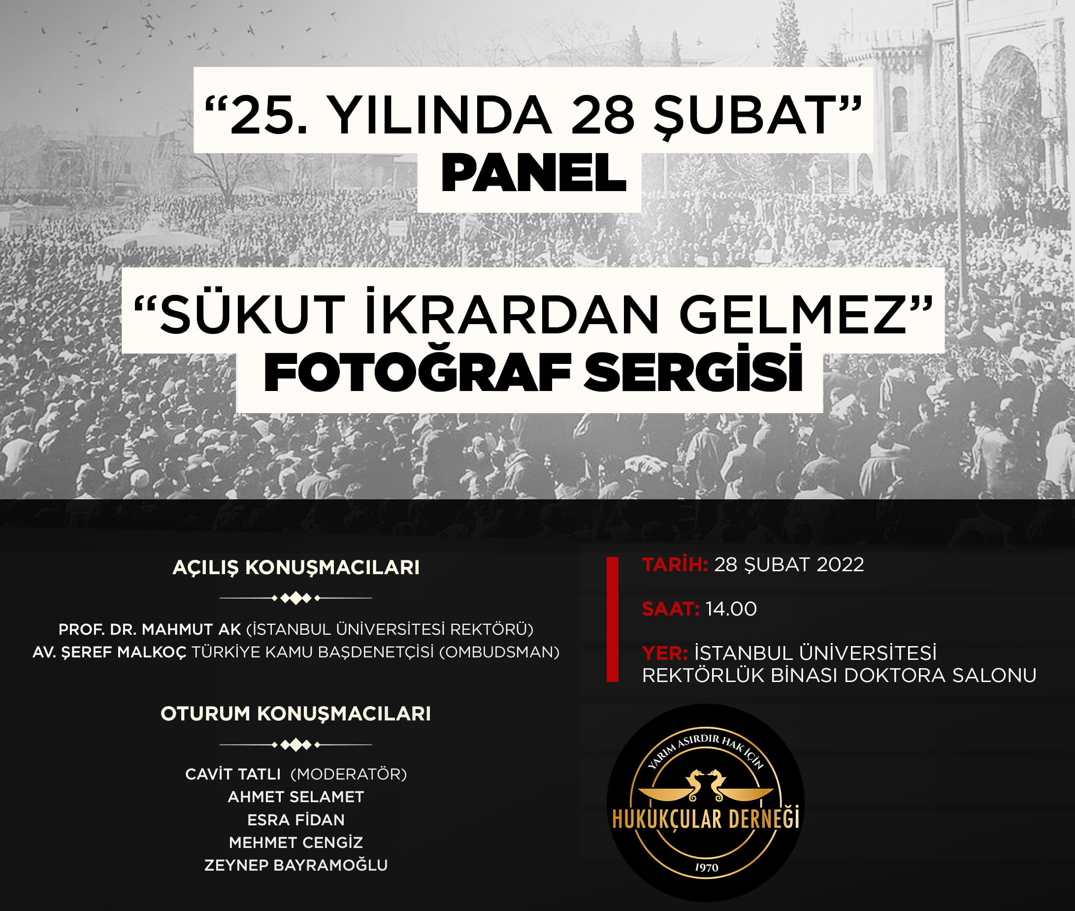 25. Yılında, 28 Şubat Postmodern Darbesi”ni değerlendirmek için dönemin sembol yerlerinden olan İstanbul Üniversitesi Doktora Salonu’nda düzenlediğimiz “25. Yılında 28 Şubat” başlıklı PANELİMİZ, Türkiye Kamu Başdenetçisi Av. Şeref Malkoç’un teşrifleriyle gerçekleşti. Dönemin en etkileyici karelerinden oluşan “Sükut İkrardan Gelmez” isimli FOTOĞRAF SERGİMİZ, halen devam etmekte olup yarın akşama kadar İstanbul Üniversitesi Doktora Salonu önünde ziyaret…