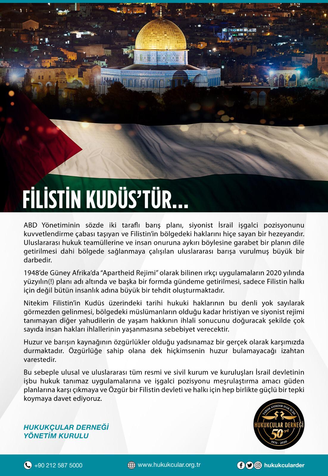 DetaylarABD-İsrail yönetimlerinin tek taraflı ve hukuksuz sözde barış planına ilişkin basın açıklamamızdır. #FreePalestine Hukukcular Derneği