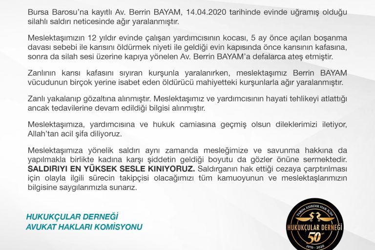 Nis192020 14.04.2020 TARİHİNDE BURSA BAROSU’NA KAYITLI MESLEKTAŞIMIZ BERRİN BAYAM’IN MARUZ KALDIĞI SİLAHLI SALDIRI HAKKINDA KINAMA