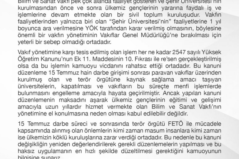 Oca232020 BİLİM VE SANAT VAKFI YÖNETİMİNİN VAKIFLAR GENEL MÜDÜRLÜĞÜ’NE DEVREDİLMESİNE İLİŞKİN BASIN AÇIKLAMASI