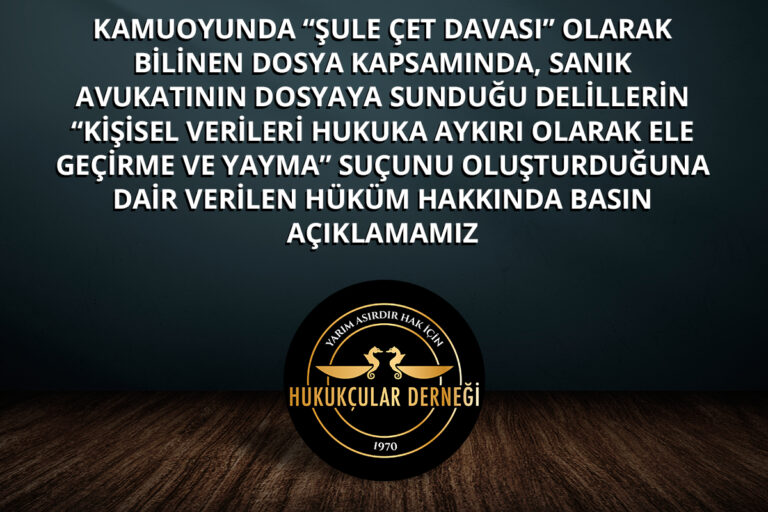 Oca62022 Kamuoyunda “Şule Çet Davası” Olarak Bilinen DosyaKapsamında, Sanık Avukatının Dosyaya Sunduğu Delillerin “Kişisel Verileri Hukuka Aykırı Olarak Ele Geçirme ve Yayma” Suçunu Oluşturduğuna Dair Verilen HükümHakkında Basın Açıklamamız