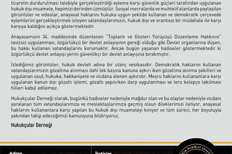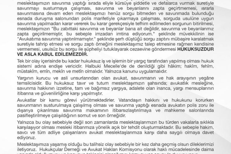 Oca142020 10.01.2020 TARİHİNDE DERNEĞİMİZ ÜYESİ MESLEKTAŞIMIZ AVUKAT BAHAR BAL’IN ŞAHSINDA SAVUNMA HAKKININ VE AVUKATLIK MESLEĞİNİN MARUZ KALDIĞI HUKUKSUZLUKLAR HAKKINDA BİLGİLENDİRME VE KINAMA