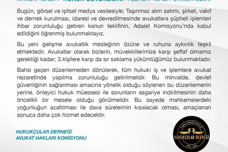 Ara212020 Avukatlara “Şüpheli İşlemleri İhbar Zorunluluğu” Getiren Kanun Teklifi “Hukuk Güvenliğini” Alenen Tehdit Etmektedir.