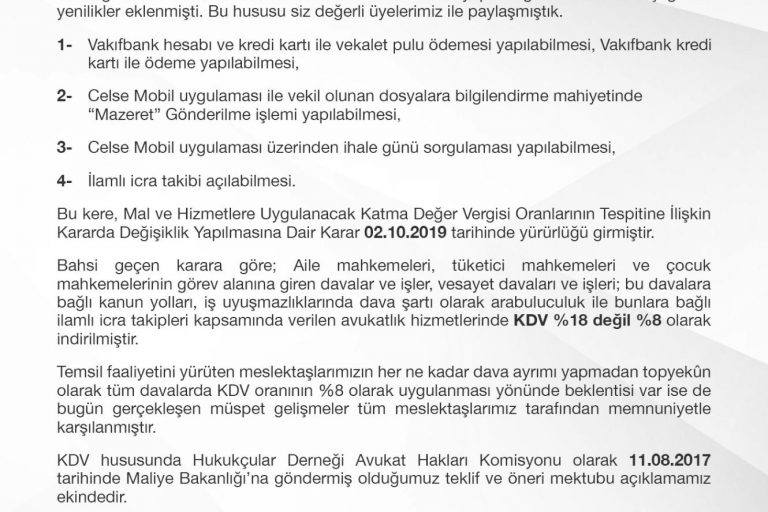 Eki32019 HUKUKÇULAR DERNEĞİ OLARAK İLGİLİ BAKANLIKLARA İLETTİĞİMİZ SORUNLARIN BİR KISMI DAHA ÇÖZÜME KAVUŞMUŞTUR