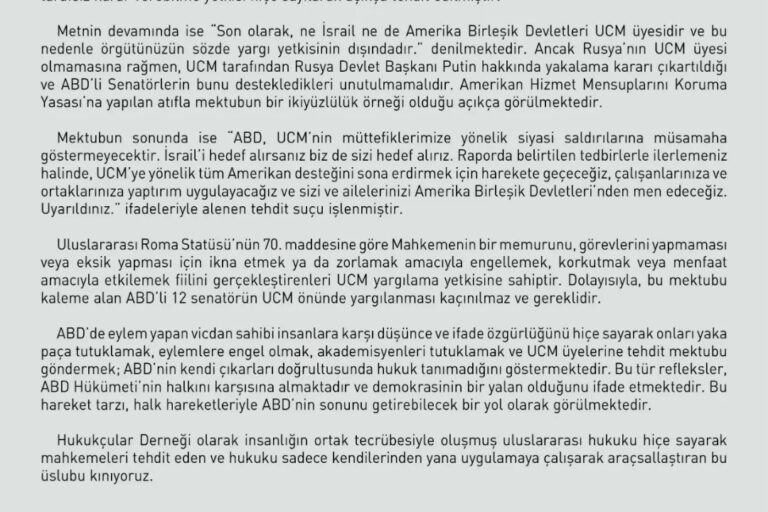 Tem62024 Amerikalı Senatörlerce Uluslararası Ceza Mahkemesine Yazılan Tehdit İçerikli Mektup Hakkında Açıklamamız