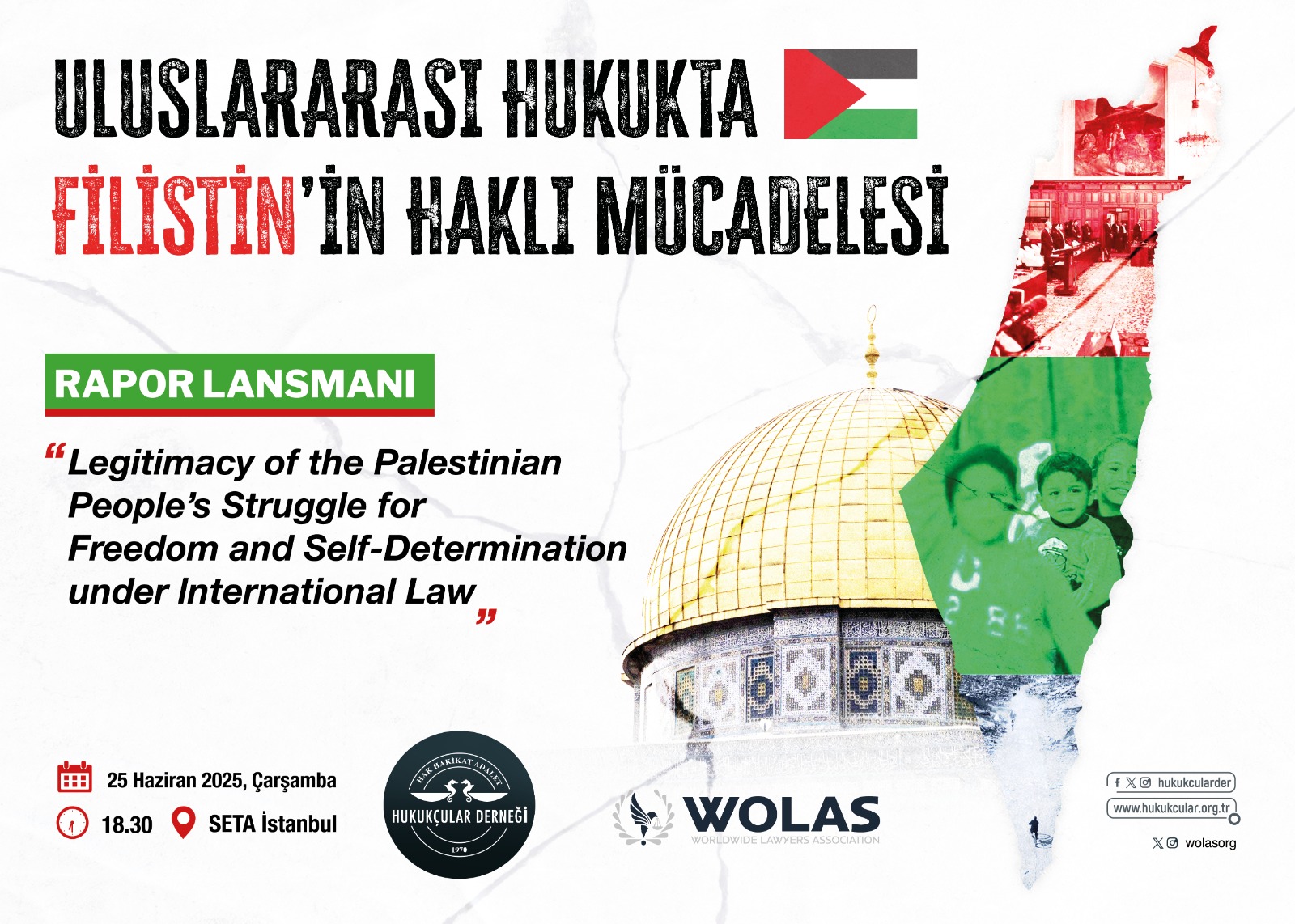 Hukukçular Derneği ve Yeryüzü Avukatları Derneği (WOLAS) iş birliğiyle hazırlanan “Uluslararası Hukuk Bağlamında Filistin Halkının Özgürlük ve Kendi Kaderini Tayin Hakkı” başlıklı kapsamlı rapor, düzenlenen lansman programıyla kamuoyunun ve hukuk dünyasının dikkatine sunulmuştur.