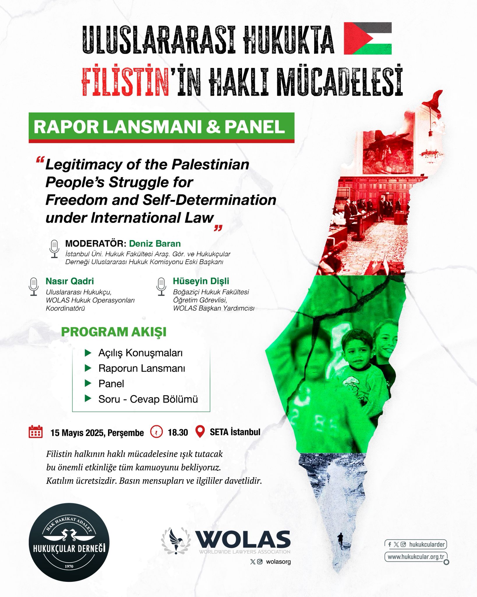 Filistin’de devam eden işgal ve sömürü düzenine karşı Filistin halkının sergilediği haklı mücadelenin; uluslararası hukuk normları ile uyumlu, hukuki ve ahlaki bir zemin taşıdığına dair hazırlanan bu kapsamlı rapor, düzenlenecek panel eşliğinde kamuoyu ile paylaşılacaktır.