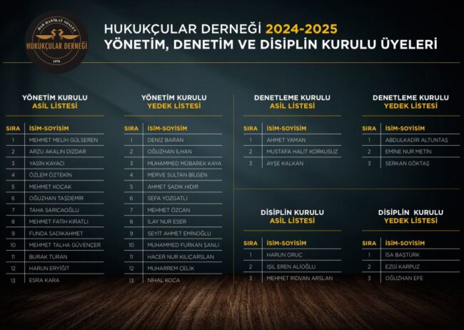 Hukukçular Derneği olarak kuruluşumuzun 54. yılında Olağanüstü Genel Kurul toplantımızı üyelerimizin yoğun katılımı ile icra ettik. Av. Mehmet Melih Gülseren Başkanlığında oybirliğiyle göreve başlayan Yönetim Kurulu, Denetleme Kurulu ve Disiplin Kurulu üyelerimize; 2024-2025 dönemindeki görev süreleri boyunca başarılar diliyor, Genel Kurulumuza katılan tüm üyelerimize şükranlarımızı sunuyoruz.