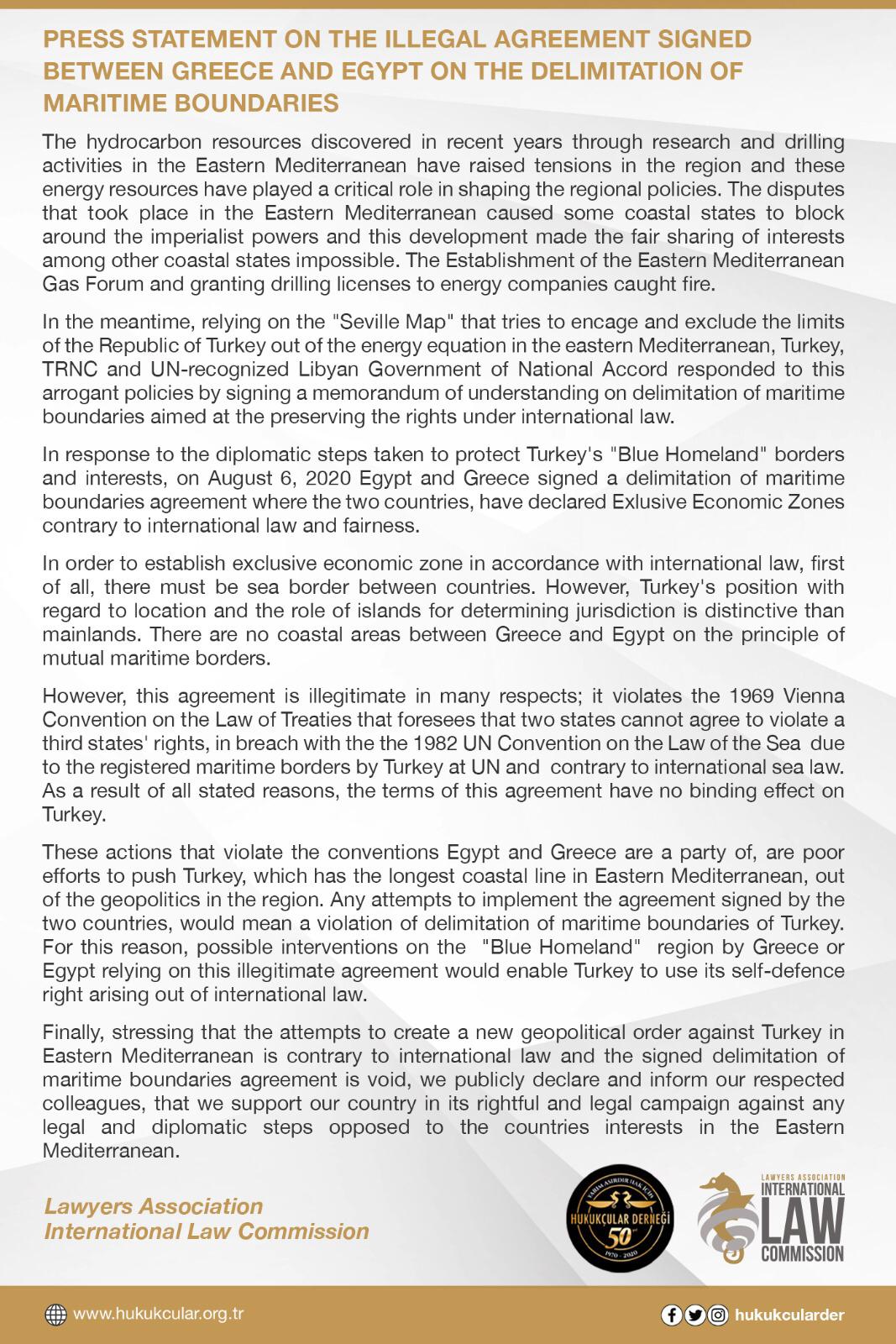 Finally, stressing that the attempts to create a new geopolitical order against Turkey in Eastern Mediterranean is contrary to international law and the signed delimitation of maritime boundaries agreement is void, we publicly declare and inform our respected colleagues, that we support our country in its rightful and legal campaign against any legal and diplomatic steps opposed to the countries interests in the Eastern Mediterranean.