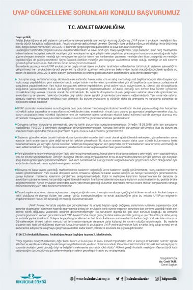 09.03.2018 tarihinde UYAP sisteminde yapılan güncelleme kapsamında, güncellemenin getirdiği sorunlar ile sistemin eski hale getirilmesi talebimizi Sayın Adalet Bakanlığı’na bildirdik. Konuyu takip etmekte olduğumuzu meslektaşlarımızın bilgisine sunarız.